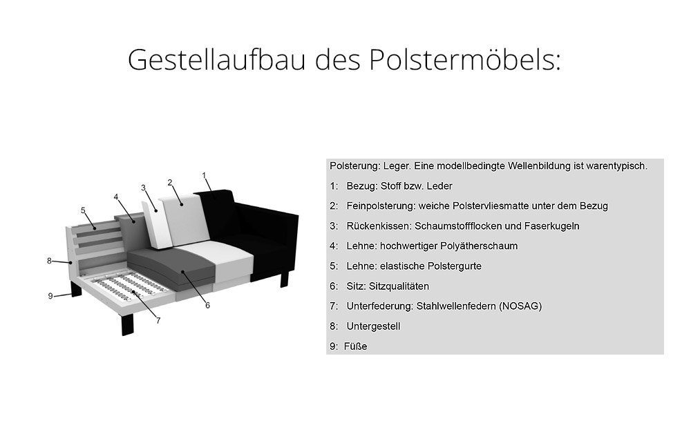 • Eine legere Polsterung ist modellbedingt gewollt und stellt keinen Qualitätsmangel dar. Bei Ausführung in Leder sind zusätzliche Ledernähte angebracht! Einige Bezüge (Velours, Microfaser) weisen starke Schattierungen auf und changieren je nach Blickrichtung. Das heißt, bei unterschiedlichen Beleuchtungs- sowie Blickwinkeln kommt es zu einem Farbwechsel bzw. zu einer farblichen Veränderung des Bezuges. Wird ein Lederbezug gewählt ist die Biesennaht immer eine offene Naht.