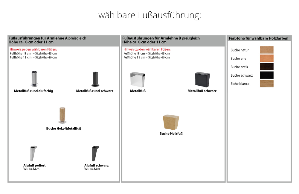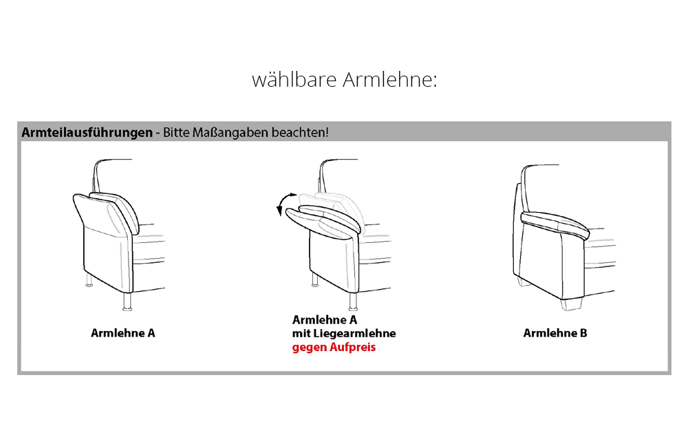 • Alle angegebenen Breitenmaße beziehen sich auf die Armlehne A ohne Funktion. Wird eine Liegearmlehne gewählt, bitte ca. 14 cm pro Armteil dazurechnen. Für Armlehne B bitte ca. 4 cm pro Armteil dazurechnen.