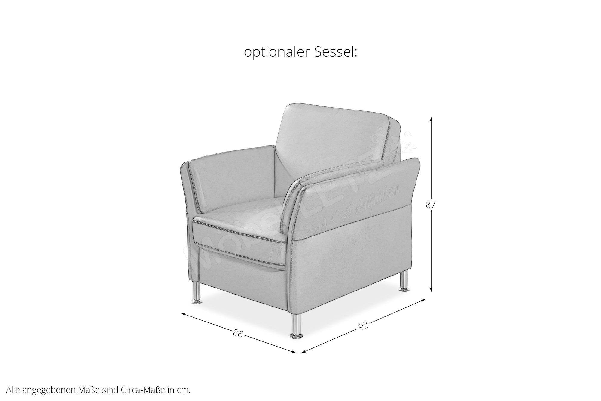 • Alle angegebenen Höhenmaße beziehen sich auf die Sitzhöhe ca. 43 cm. Wird die Sitzhöhe ca. 46 cm gewählt, beträgt die Gesamthöhe etwa 90 cm.